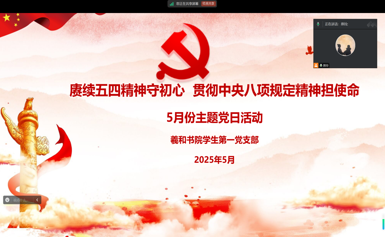 为深入学习贯彻习近平新时代中国特色社会主义思想,弘扬五四精神,强化青年党员使命担当,扎实推进党风廉政建设,5月25日,羲和书院学生第一党支部以“赓续五四精神守初心,贯彻中央八项规定精神担使命”为主题,组织开展政治理论学习暨主题党日活动,全体支部党员参加。