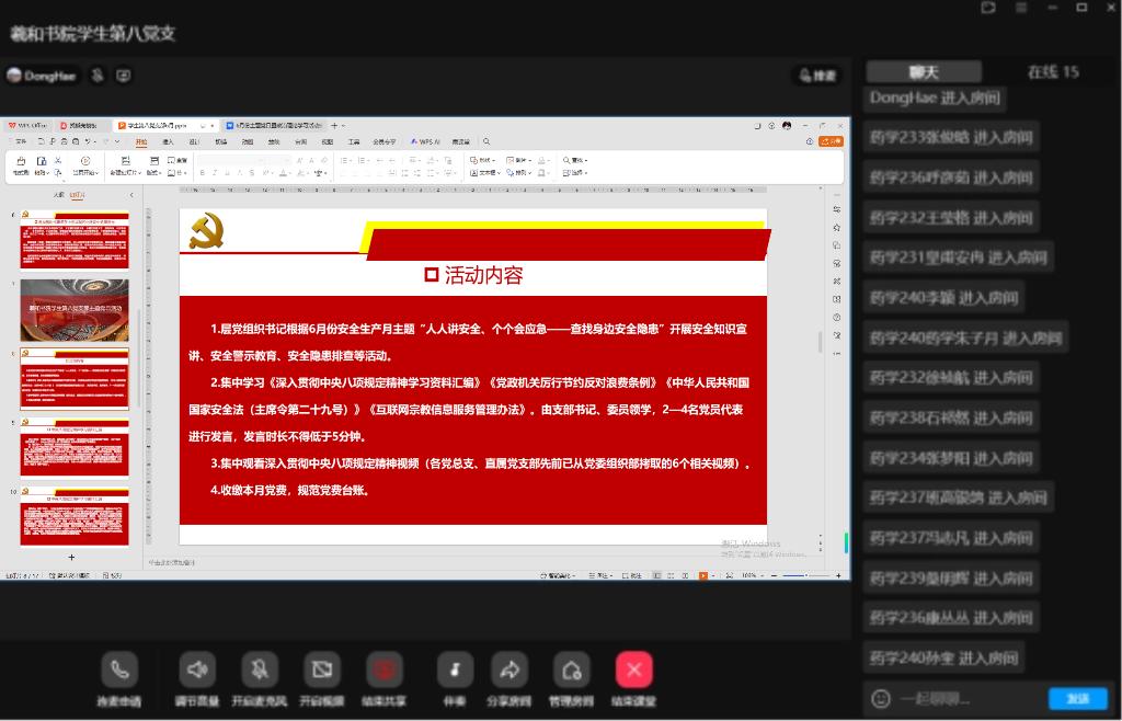 6 月 13 日,羲和书院学生第八党支部通过线上会议开展“筑牢安全防线 恪守纪律底线 以实干担当推动高质量发展”主题党日暨政治理论学习活动。会议由党支部书记侯天伦主持,支部全体党员、入党积极分子以及师生代表积极参与,深入学习相关精神,进一步增强党性修养和责任意识。