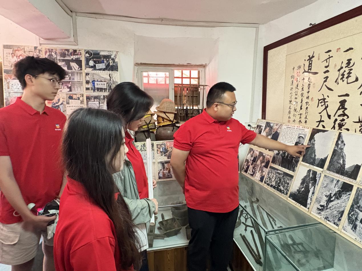 上午,实践团在申田裕老师的带领下,首先来到了“十三勇士”展览馆。展览馆内,斑驳的历史气息扑面而来。展柜中,锈迹斑斑的钢钎、布满裂痕的铁锤、陈旧的藤条帽以及昏黄的煤油灯静静陈列,墙上一幅幅修路的照片,展示这那段开山劈路的热血岁月。队员王路、徐佳慧等成员,站在照片前,久久凝视。申田裕化身 “历史讲解员”,沿着展陈脉络,为实践团成员详细介绍每一件工具及其用途。让成员们深刻感受到郭亮村村民不畏艰险、攻坚克难的坚定信念。