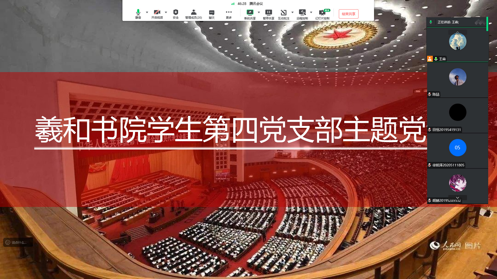 9月25日,羲和书院学生第四党支部通过腾讯会议平台开展弘扬红船精神,传承红色基因专题党课活动。会议由党支部书记王森主持,全体党员参会。
