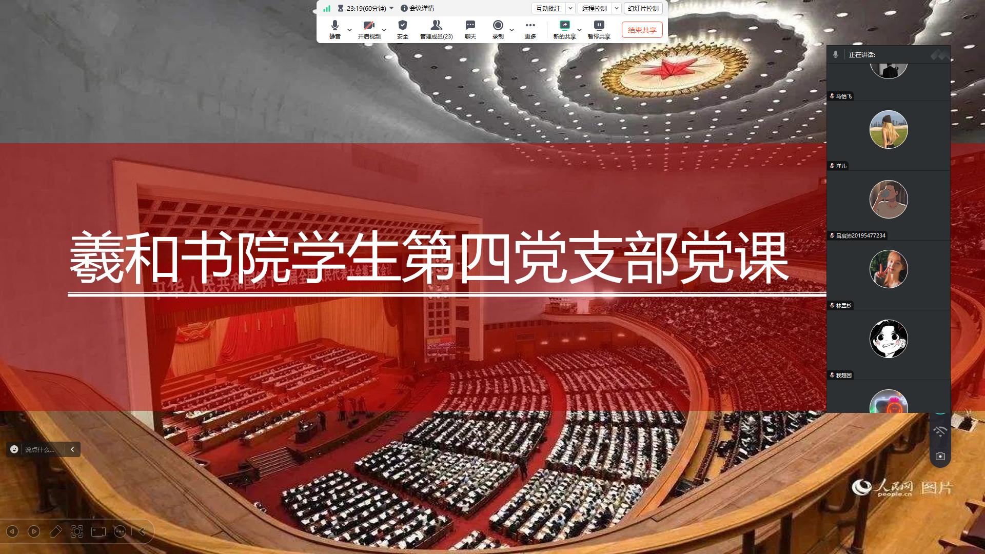 为深刻领悟爱国主义精神的时代内涵,凝聚奋进力量,11月21日晚,羲和书院学生第四党支部通过腾讯会议平台开展“大力弘扬伟大爱国主义精神,把强国建设、民族复兴伟业不断推向前进”专题党课活动。会议由党支部书记王森主持,全体党员参会。