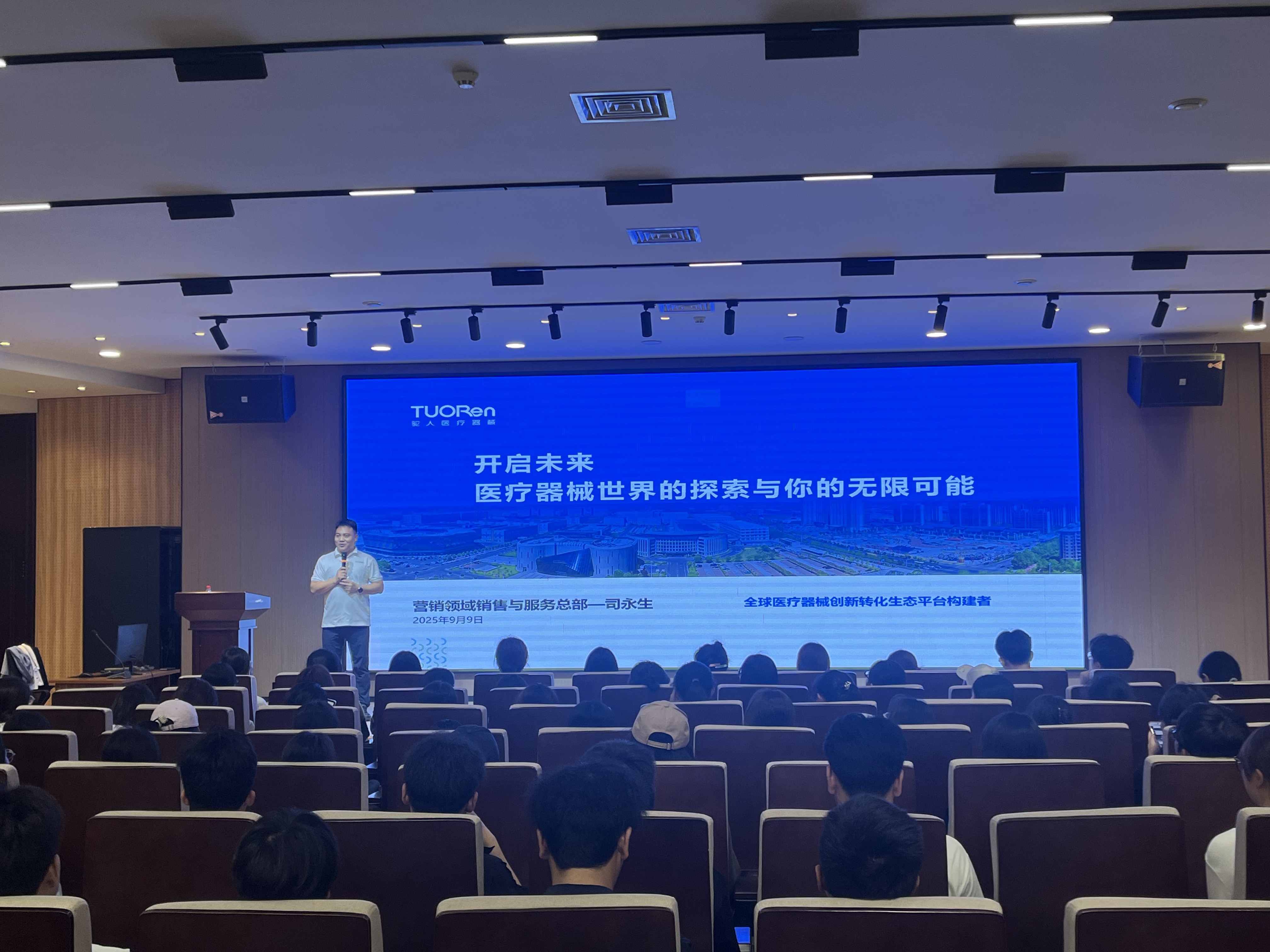 活动的最后环节是由优秀校友、驼人集团安徽省销售总监司永生带来的主题分享——“医疗器械世界的探索与你的无限可能”。司永生结合自己从母校毕业生到企业高管的成长经历,从三个方面展开阐述:首先,他分析了全球及国内医疗器械行业的现状与未来趋势,指出随着医疗需求提升和技术创新加速,该领域发展前景广阔;其次,他详细讲解了医疗器械技术创新的典型路径与核心挑战,强调多学科交叉融合的重要性;最后,他就职业规划向学弟学妹提出切实建议,鼓励大家尽早树立目标,夯实专业知识,积极投身实践,在“医学”与“工程”深度融合的浪潮中找准自身定位,实现个人价值。