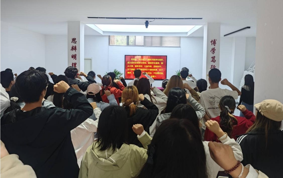 “我宣誓,我志愿加入羲和书院学生组织,服从组织的领导与安排。敢做学生表率,服从大局,服务学校:以身作则,团结协作;甘于奉献。我愿承担学生干部的职责,忠于集体,团结协作,不徇私枉法,不知难而退。” 在学生会主席谷泽坤的带领下,全体参会成员高举右拳,以铿锵有力的誓言许下承诺。誓言不仅是对 “承担学生干部职责、忠于集体、不徇私枉法、不知难而退” 的庄严表态,更将“服务集体、担当责任”的信念深植于心,彰显了羲和学子以青春之力助力书院发展的坚定决心。