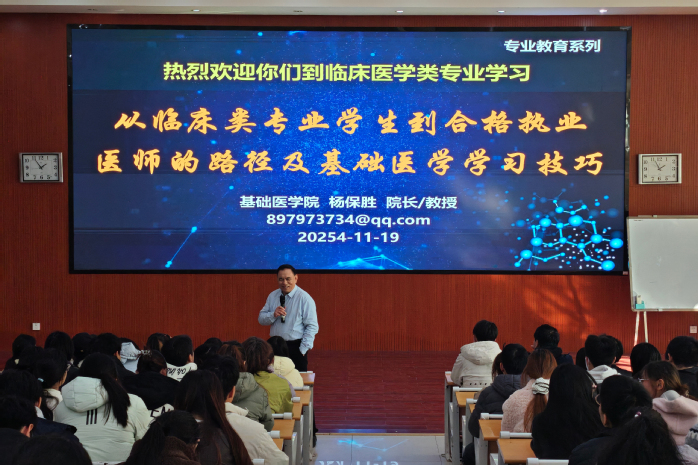 为助力医学学子筑牢专业根基、明晰成长路径,11月19日下午,《思邈论方》讲坛在D2教室隆重开讲。2025级临床医学、医学影像学等专业师生齐聚一堂,共赴这场医学教育与职业发展的思想盛宴。基础医学院院长杨保胜教授担任主讲嘉宾,以“从临床类专业学生到合格执业医师的路径及基础医学学习技巧”为核心议题,为青年学子奉上了一场兼具理论深度、实践温度与前瞻视野的精彩分享,为未来医者的成长之路点亮明灯。