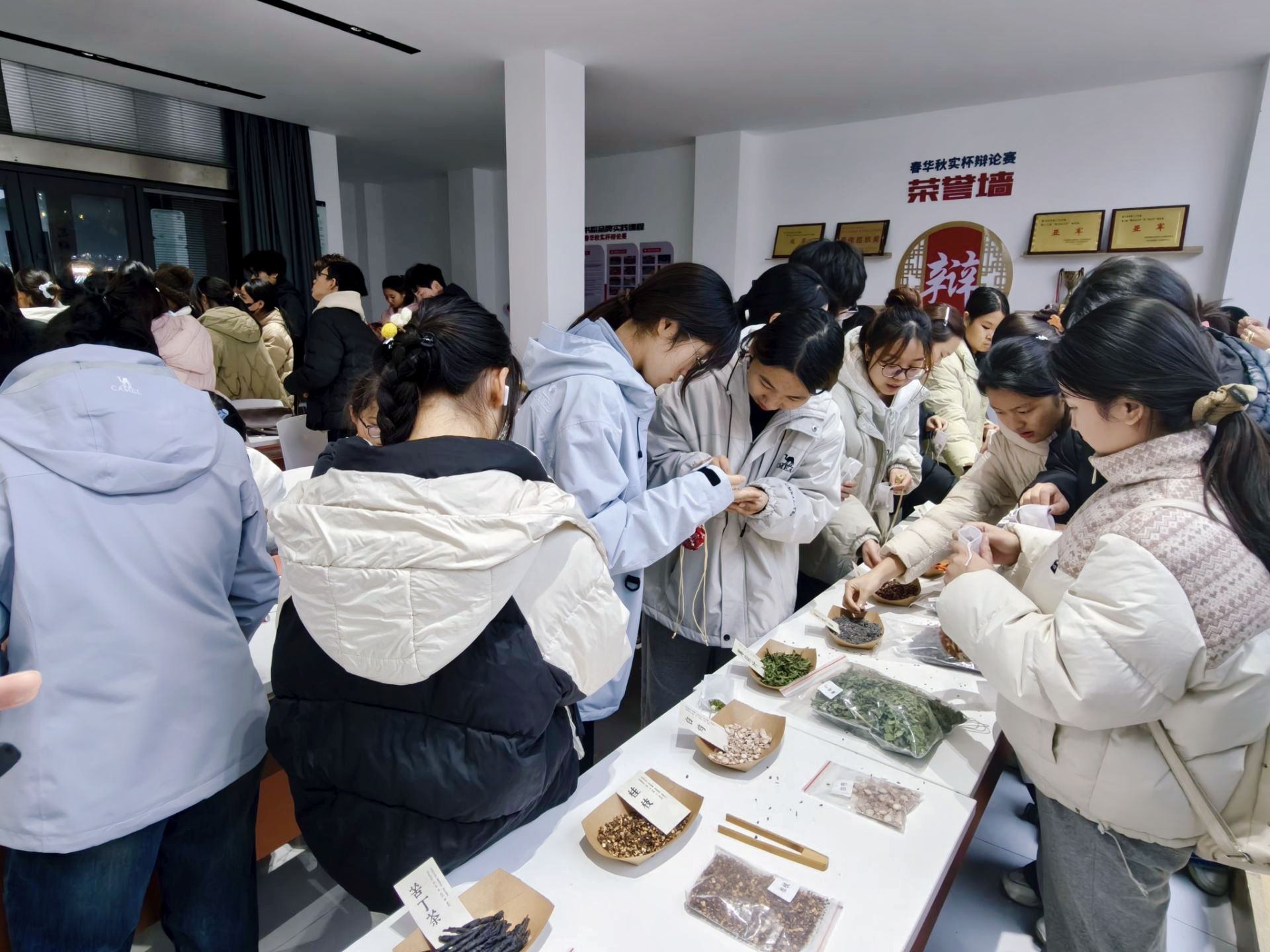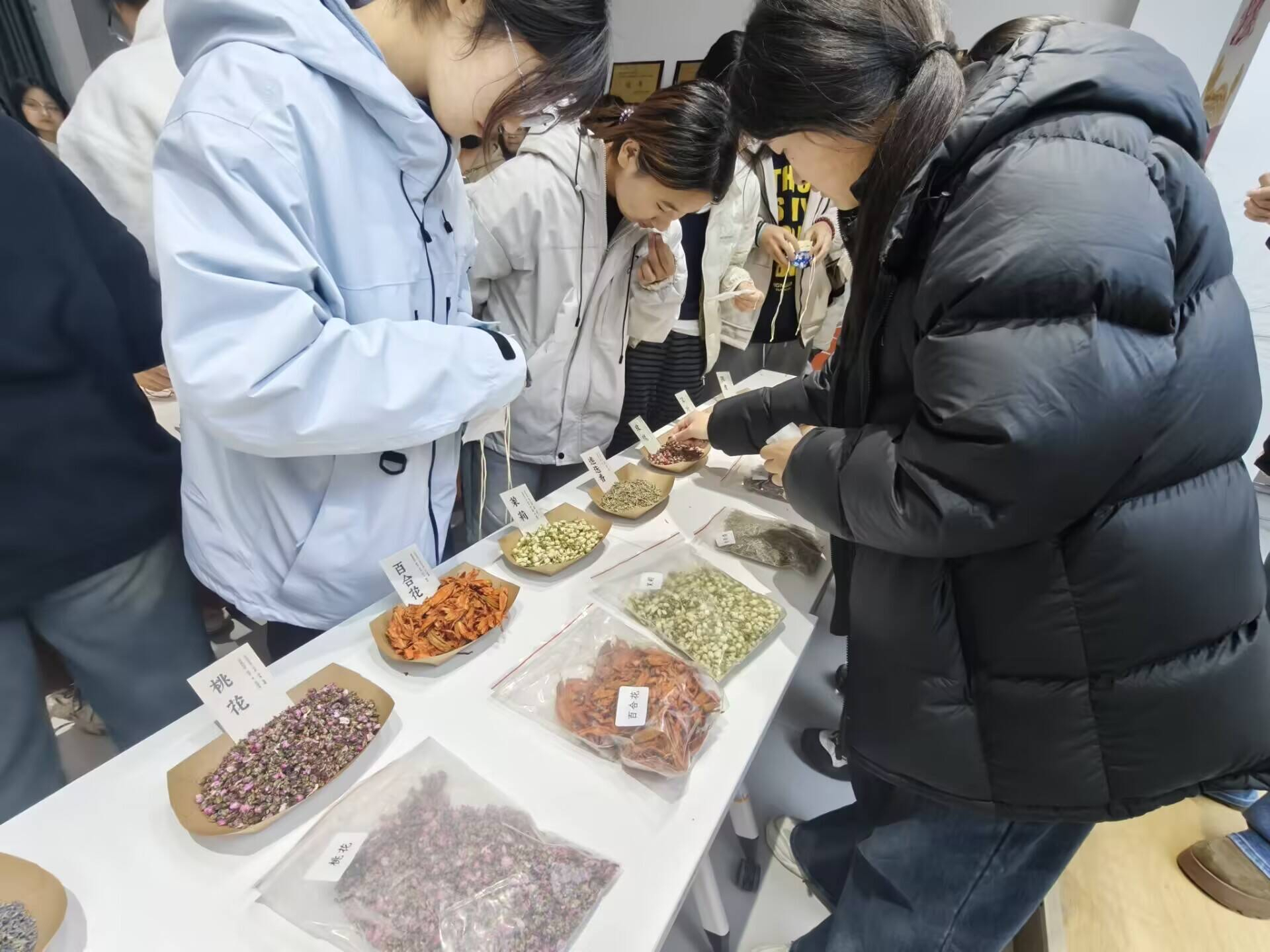 当归的醇厚、黄芪的温润、薄荷的清冽交织弥漫,勾勒出传统医药与现代校园交融的独特景致。活动以《中药学》课程核心知识为锚点,深度溯源《本草纲目》古方精髓,筛选适配药材并打造沉浸式药材知识展架,让同学们在动手实践前,完成了一场从理论到具象的专业知识复盘。辨识药材性味、梳理配伍逻辑、精准称量分装专业严谨与传统香包制作的巧思雅致在此碰撞交融。