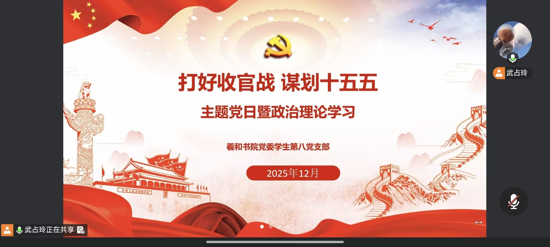 羲和书院学生第八党支部于12月15日通过线上会议开展“打好收官战 谋划十五五”主题党日活动,支部全体党员、入党积极分子及学生代表参加。