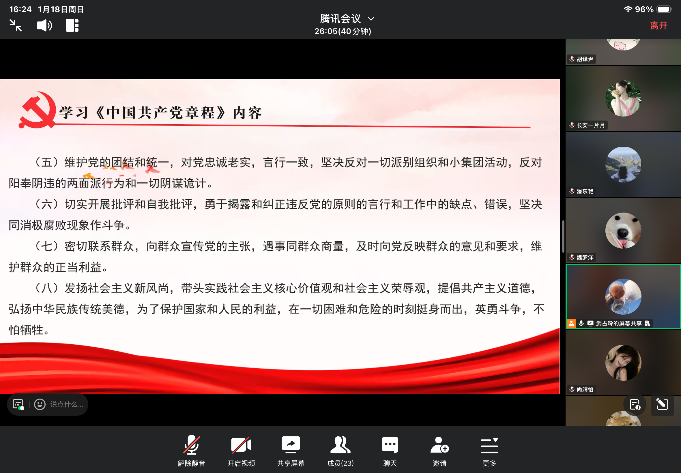1月19日,羲和书院学生第八党支部在腾讯会议召开“查摆剖析明方向,凝心聚力开新局”主题党日暨政治理论学习活动,会议由支部书记武占玲主持,支部全体党员、入党积极分子及学生代表参加。