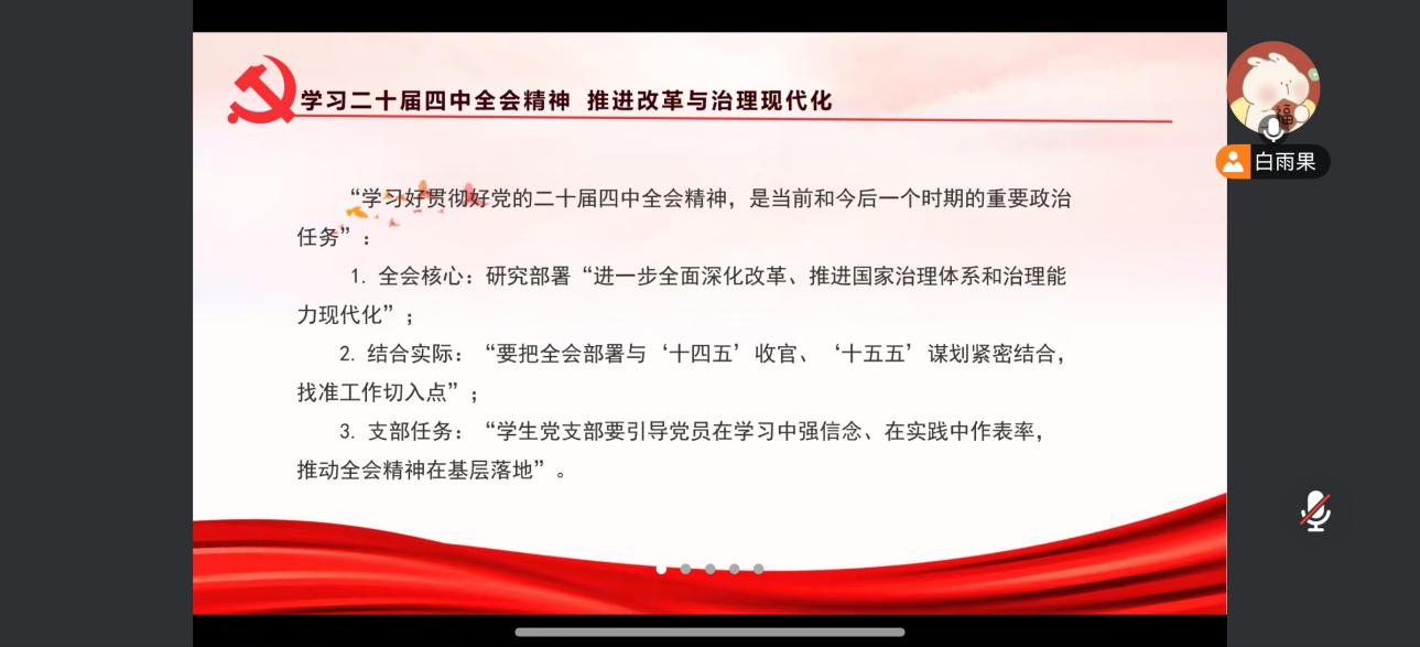 白雨果领学《习近平:学习好贯彻好党的二十届四中全会精神》,深刻领会全会通过的《决定》核心要义,明确其作为指导“十五五”时期经济社会发展的纲领性文件的重要地位,认识到学习贯彻全会精神是当前和今后一个时期的重大政治任务。