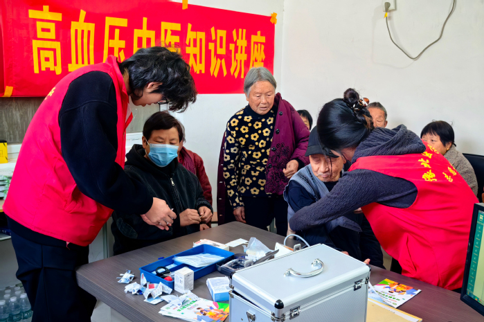 活动当天,羲和书院11名师生志愿者与老庄村卫生室医护人员携手开展免费血压、血糖监测服务。活动现场,志愿者们分工明确、秩序井然,以严谨细致的态度投入服务:测量血压时,俯身轻挽老人衣袖、精准调整袖带,不放过任何细节;采集血糖时,动作严谨规范,认真记录每一组监测数据。针对监测数值异常的老人,志愿者们结合专业知识,耐心询问其日常饮食、作息习惯,细致讲解注意事项,叮嘱老人及时到正规医院复查,用专业与贴心为老人的健康保驾护航,让便民服务真正落到实处。