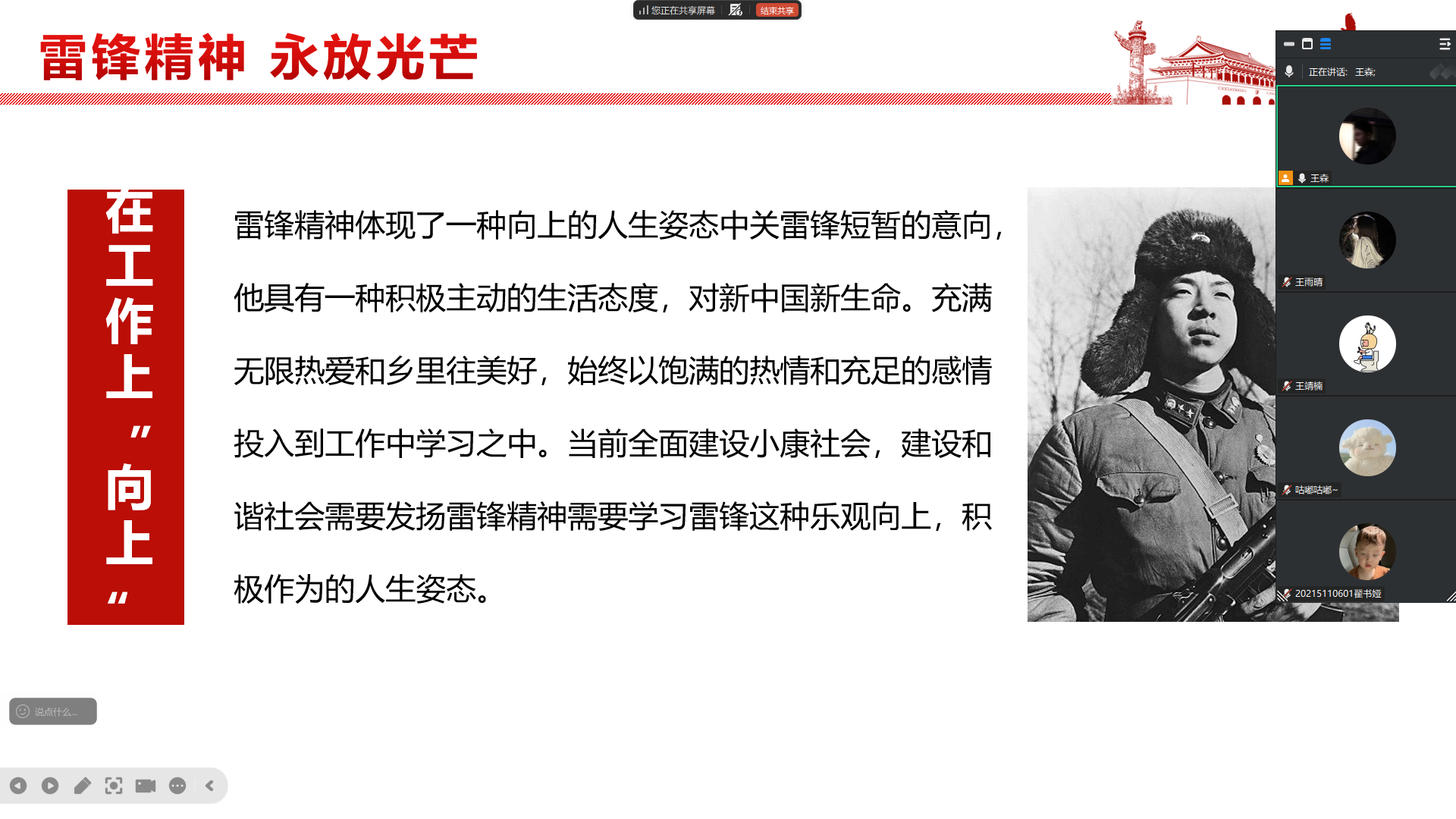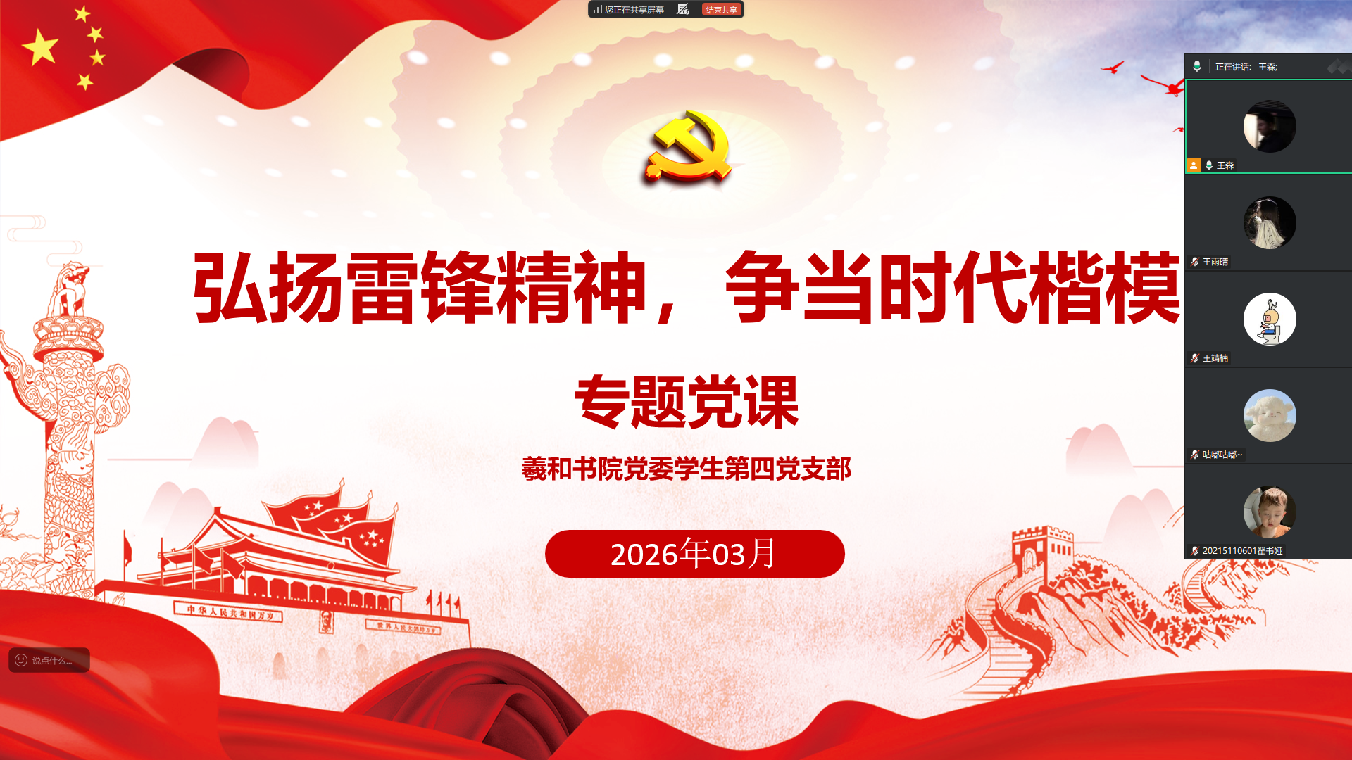 为深入弘扬雷锋精神,引导支部党员践行时代担当,3月24日,羲和书院学生第四党支部通过腾讯会议形式开展“弘扬雷锋精神,争当时代楷模”专题党课,会议由党支部书记王森主持,全体党员参会。